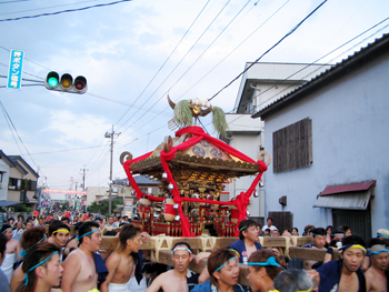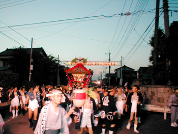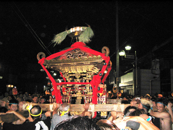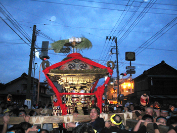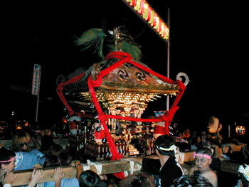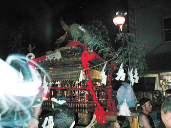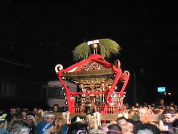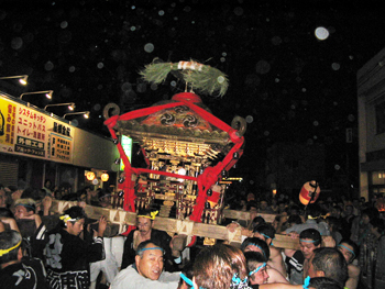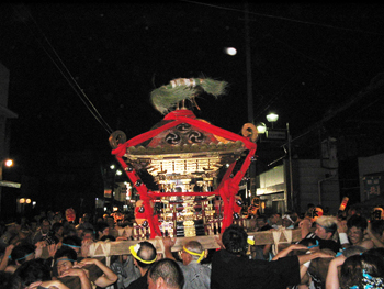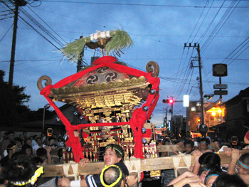 ■午後六時から十時まで渡御が行われます。独特の担ぎ方、大神輿を煽る姿は勇壮そのもので、法螺貝の響きと共に担ぎ手は熱く燃え上がります。